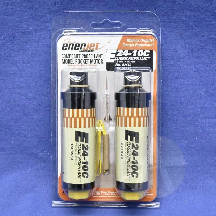 The E24C rocket motor is a true “Blast From the Past” as it mimics the look, sound and performance of the original Enerjet Propellant. The motor has a translucent exhaust plume studded with supersonic shock diamonds and no smoke, which appears to make your rocket leap off the launch pad.Â