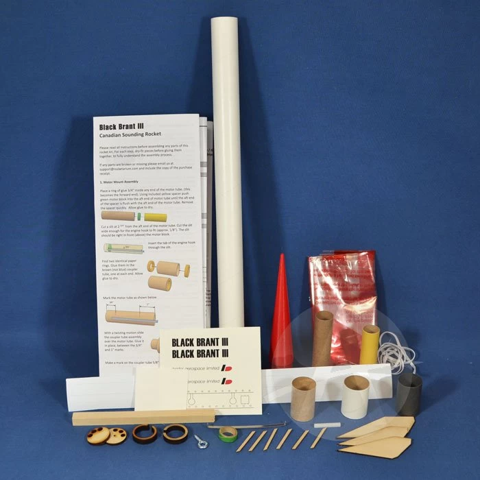 The real Black Brant III is a Canadian sounding rocket designed to launch small payloads of up to 39 pounds to around 72 miles high into the atmosphere. This single-stage scale kit is about 21.8 inches tall and features a 3D printed nose cone, laser-cut basswood fins, water-slide self-adhesive decals, and quick-change engine hook.