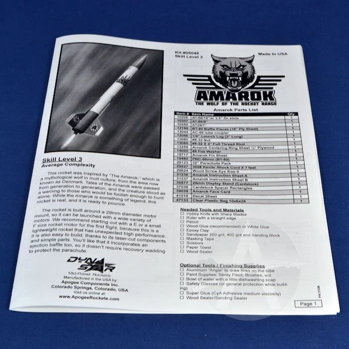 This mid-power size rocket was inspired by “The Amarok,” which is a mythological wolf in Inuit culture. It is lightning quick and ready to rip the sky apart. Powered by 29mm diameter motors, this rocket is easy to build, and makes a great first mid-power rocket.