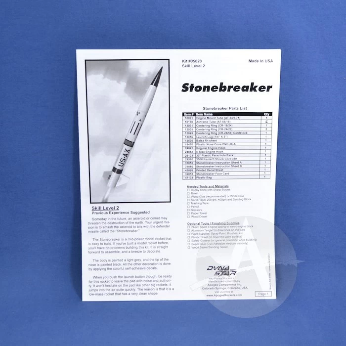 The StoneBreaker is a popular mid-power kit that flies on C through F size rocket engines. It is easy to build, and comes with great graphics to give it a lot of eye-appeal. The highly illustrated instructions make it an easy build too.
