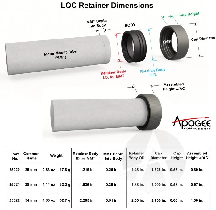 This is the LOC version of the screw-on retainer. Use it to safely restrain your 54mm diameter rocket motors from moving either forward or rearward in the rocket.
