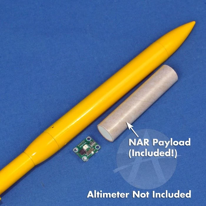 The Midge was specifically designed for the NAR’s “Payload Altitude” contest event, but it can be flown just for fun too. It is a two-stage rocket designed to carry both a small altimeter and the 28-gram NAR Standard Payload weight.