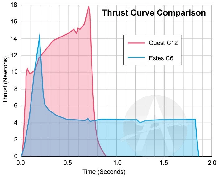 The Quest C12-6 is a great all-around motor for your typical rockets. It is particularly suited for heavier or larger diameter rockets. It features composite propellant, which has twice the energy as a black powder motor. Same size and diameter as an Estes motor, so it fits all your favorite rockets. But this is for single-stage rockets only, as it cannot be staged.
