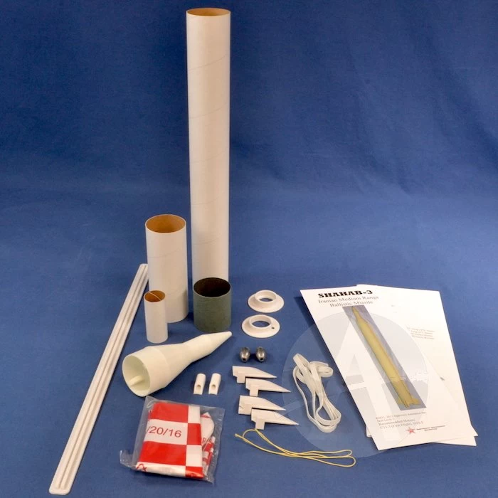 This 1/27th scale model of the SHAHAB-3 is similar to the old SCUD missile. This model rocket kit is simple to build and flies great on 24mm diameter motors.