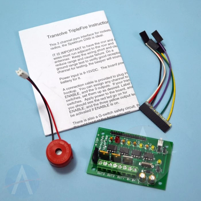 Allows you to manually control pyro outputs on your high-power rocket with an RC radio. Useful for staging, air-starts, and parachute deployment charges. Allows firing of 3 different pyro outputs, with a 4 channel spread spectrum radio.
